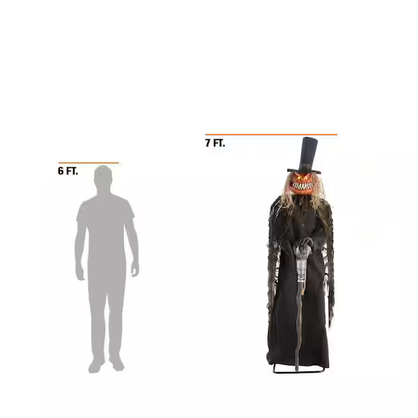 Sobald der Bewegungssensor aktiviert wird, beginnt er zu sprechen und warnt neugierige Besucher und kleine Geister, sich nicht zu nah heranzuwagen. Sein Kopf dreht sich von Seite zu Seite, während sich sein Mund synchron zu den 5 schaurigen Sprachphrasen bewegt.