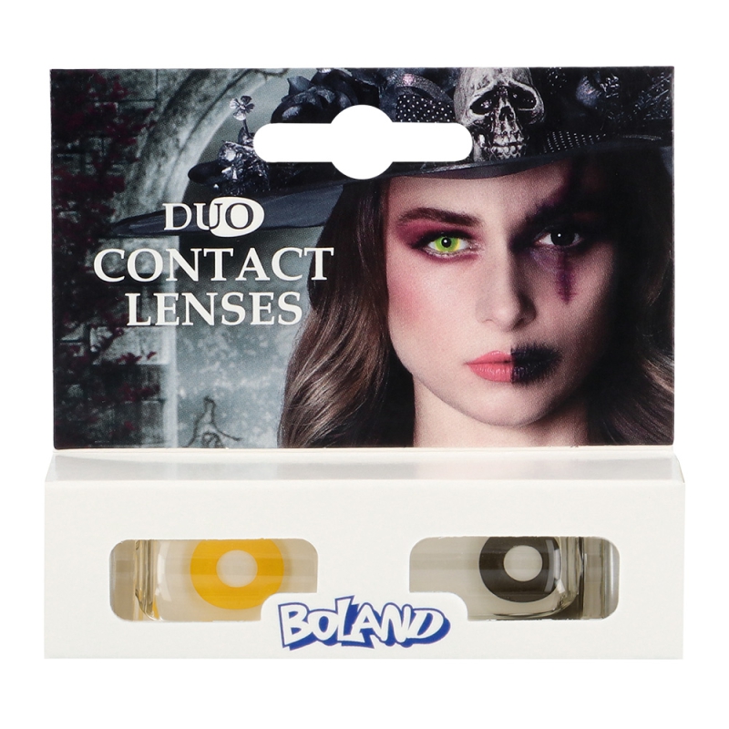 Diese Duo-Linsen sind auffällig: Es handelt sich um ein zweifarbiges Set aus 1 schwarzen und 1 leuchtend gelben Glas. Der Kontrast zwischen diesen 2 Linsen macht dein Halloween-Outfit noch aufregender und gruseliger. Perfekt für ein böses Hexenkostüm, aber vor allem können Sie Ihrer Fantasie freien Lauf lassen und die Leute mit dieser auffälligen Kombi erschrecken. Diese weichen Kontaktlinsen können 3 Monate lang verwendet werden, so dass Sie auch nach der Party noch mit 2 verschiedenen Augen schockieren können.