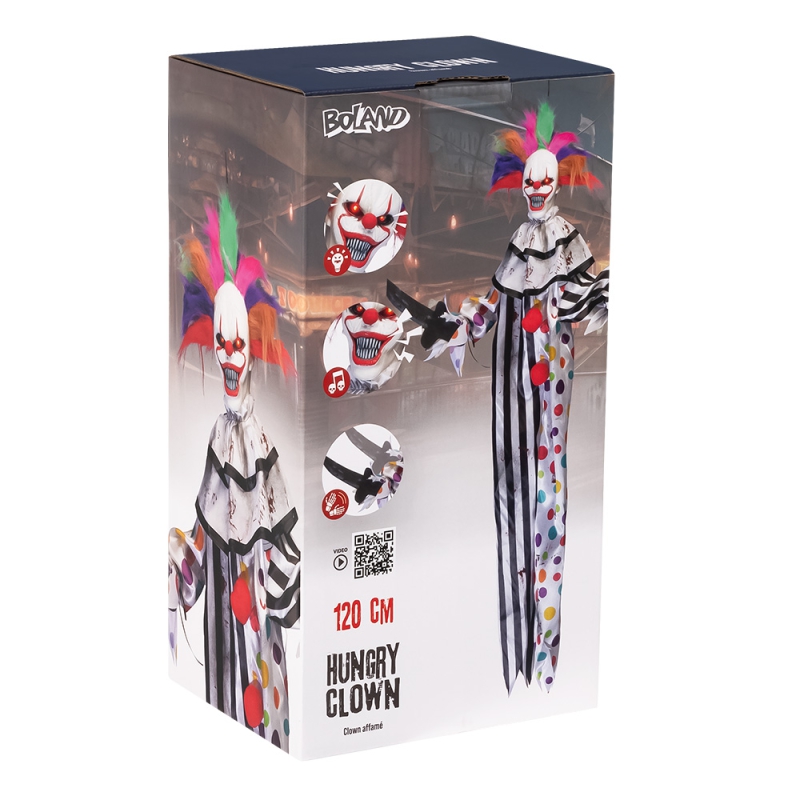 Dieser gutaussehende Clown ist bereit, jeden an Halloween vor Angst erzittern zu lassen. Mit seinem gruseligen Aussehen, blutigen Geräuschen, leuchtenden Augen und unerwarteten Bewegungen ist diese 120 cm lange Hängedekoration die ultimative Halloween-Dekoration. Sie wird durch Bewegung aktiviert und sorgt bei jedem, der ihr zu nahe kommt, für einen Moment des Schreckens. Sehr empfehlenswert für Spukhäuser und Halloween-Veranstaltungen.